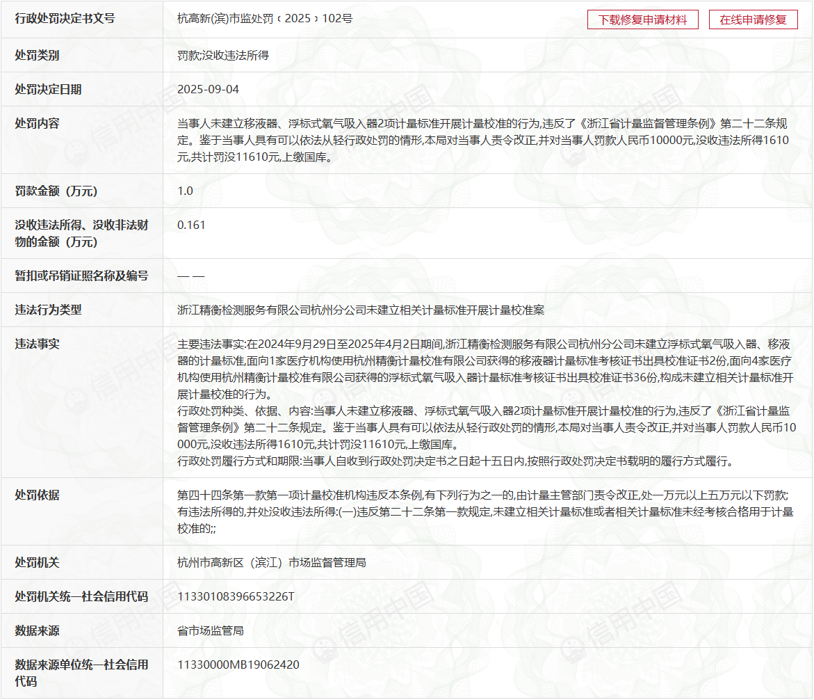 主要违法事实:在2024年9月29日至2025年4月2日期间,浙江精衡检测服务有限公司杭州分公司未建立浮标式氧气吸入器、移液器的计量标准,面向1家医疗机构使用杭州精衡计量校准有限公司获得的移液器计量标准考核证书出县校准证书2份,面向4家医疗机构使用杭州精衡计量校准有限公司获得的浮标式氧气吸入器计量标准考核证书出具校准证书36份,构成未建立相关计量标准开展计量校准的行为。