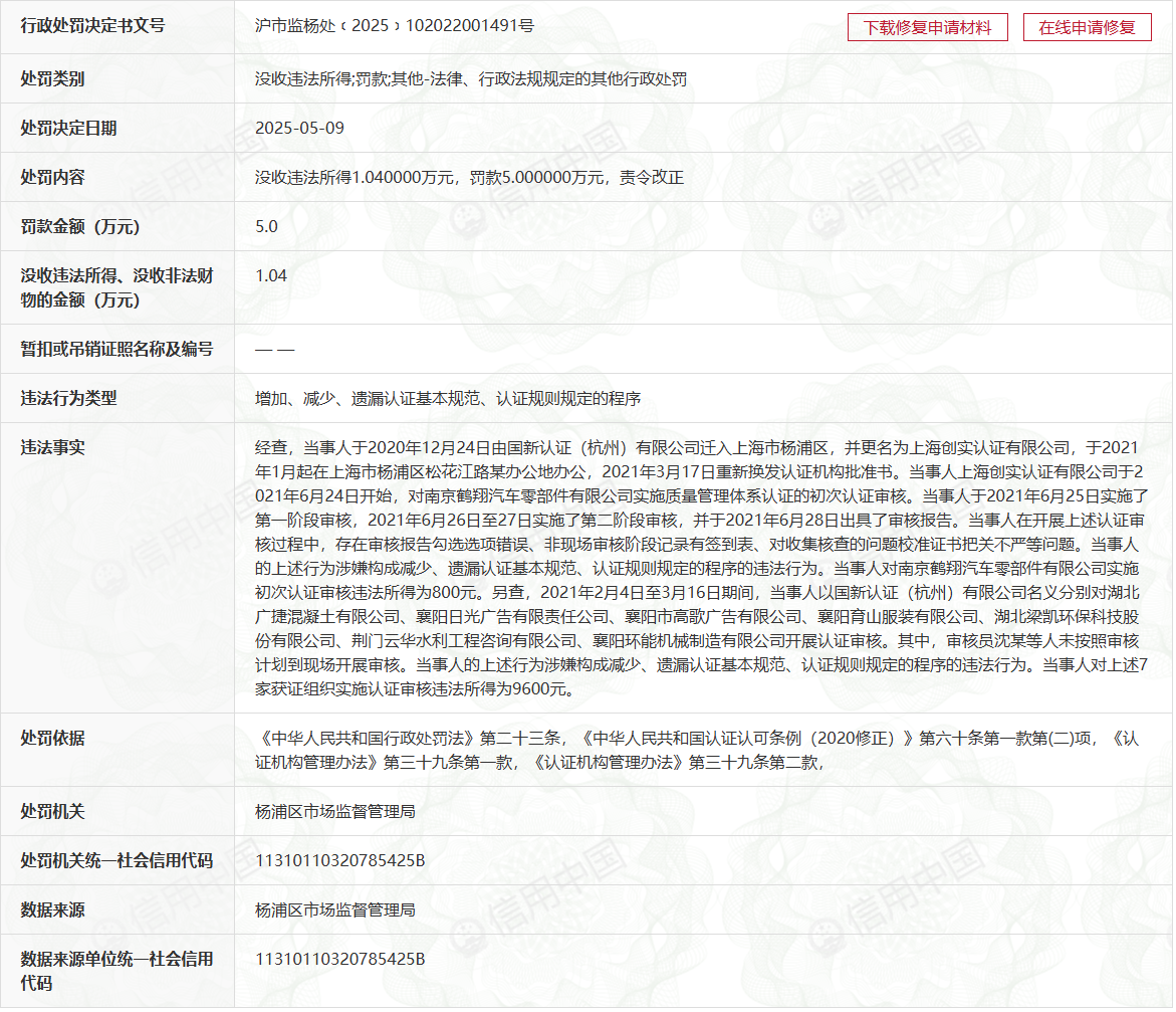 经查,当事人于2020年12月24日由国新认证(杭州)有限公司迁入上海市杨浦区,并更名为上海创实认证有限公司,于2021年1月起在上海市杨浦区松花江路某办公地办公,2021年3月17日重新换发认证机构批准书。当事人上海创实认证有限公司于2021年6月24日开始,对南京鹤翔汽车零部件有限公司实施质量管理体系认证的初次认证审核。当事人于2021年6月25日实施了第一阶段审核,2021年6月26日至27日实施了第二阶段审核,并于2021年6月28日出具了审核报告。当事人在开展上述认证审核过程中,存在审核报告勾选选项错误、非现场审核阶段记录有签到表、对收集核查的问题校准证书把关不严等问题。当事人的上述行为涉嫌构成减少、遗漏认证基本规范、认证规则规定的程序的违法行为。当事人对南京鹤翔汽车零部件有限公司实施初次认证审核违法所得为800元。另查,2021年2月4日至3月16日期间,当事人以国新认证(杭州)有限公司名义分别对湖北广捷混凝土有限公司、襄阳日光广告有限责任公司、襄阳市高歌广告有限公司、襄阳育山服装有限公司、湖北梁凯环保科技股份有限公司、荆门云华水利工程咨询有限公司、襄阳环能机械制造有限公司开展认证审核。其中,审核员沈某等人未按照审核计划到现场开展审核。当事人的上述行为涉嫌构成减少、遗漏认证基本规范、认证规则规定的程序的违法行为。当事人对上述7家获证组织实施认证审核违法所得为9600元。