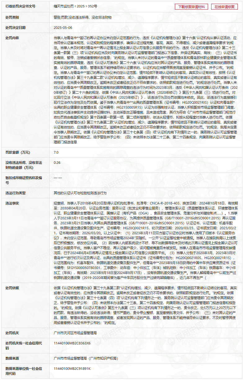 经查明,当事人于2018年4月20日取得认证机构批准书,批准号:CNCA-R-2018-403,换发日期:2024年10月18日,有效期至:2030年04月20日,认证业务范围:服务认证(批发业和零售业服务)、管理体系认证(质量管理体系认证、环境管理体系认证、职业健康安全管理体系认证、国推认证(有机产品(OGA)、食品安全管理体系、危害分析与关键控制点......)。1.当事人于2023年3月11日与青岛中**签订认证服务协议,为其提供质量管理体系(GB/T19001-2016idtISO9001:2015)再认证服务,2023年3月21日当事人向其出具质量管理体系(GB/T19001-2016idtISO9001:2015)认证证书,认证范围:机客车配件、铁路轨道交通设备及配件生产,证书编号:HG20Q0021R1S,初次颁发日期:2020/03/23,证书颁发日期:2023/03/21,证书有效期限:2026/03/20。以上认证中:(1)2023年3月11日双方签订认证协议时当事人使用了旧版本《认证服务协议》,未约定认证范围,导致青岛市市场监管局2024年“双随机、一公开”认证监督检查中被通报。当事人在接到我局以上线索后已积极整改,修改协议内容。(2)因当事人内部系统设计不好,导不出数据导致未及时将此次再认证情况上报全国认证认可信息公共服务平台。当事人客户不稳定,再认证客户很少,该问题被掩盖后未被发现。当事人在青岛市市场监督管理局反映情况后,已于2024年6月4日将再认证情况上报全国认证认可信息公共服务平台。(3)当事人分别于2020年3月、2023年3月对青岛中**进行初次认证及再认证,出具的质量管理体系认证证书(证书编号分别为:HG20Q0021R0S、HG20Q0021R1S),认证范围均为:机客车配件、铁路轨道交通设备及配件生产,但青岛中**2023年9月18日获得的中国中车供应商资质证书(证书编号:SFGYS000050780301,工序委外:动车组:中小件加工(车体)城轨地铁:中小件加工(车体)铁路客车:中小件加工(车体),有效期:2023年9月18日至2024年9月17日),没有铁路轨道交通设备生产。当事人解释青岛中**以前生产过铁路轨道交通设备(2019-2020年期间曾为客户中车四方股份生产过转向架轴箱体),近几年不再生产(