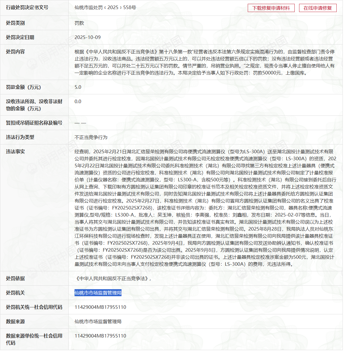 经查明,2025年2月21日湖北汇信昱荣检测有限公司将便携式流速测算仪(型号为LS-300A)送至湖北国投计量测试技术有限公司并委托其进行检定校准,因湖北国投计量测试技术有限公司无检定校准便携式流速测算仪(型号:LS-300A)的资质,2025年2月22日湖北国投计量测试技术有限公司委托科准检测技术(湖北)有限公司寻找第三方有检定校准上述计量器具(便携式流速测算仪)资质的公司进行检定校准,科准检测技术(湖北)有限公司向湖北国投计量测试技术有限公司制定了计量校准报价单(计量仪器名称:便携式流速测算仪,型号:LS300-A,含税500元等)。科准检测技术(湖北)有限公司接到委托后自行从网上查询、下载印制有方圆检测认证集团有限公司印章的校准证书范本及相关检定校准资质文件,并将上述检定校准资质文件发送给湖北国投计量测试技术有限公司,同时告知湖北国投计量测试技术有限公司将上述计量器具委托给方圆检测认证集团有限公司进行检定校准。2025年2月27日,科准检测技术(湖北)有限公司冒用方圆检测认证集团有限公司的名义出具了校准证书(证书编号:FY202502SX7268),该校准证书详细内容为:委托方:湖北汇信昱荣检测有限公司,器具名称:便携式流速测算仪,型号/规格:LS300-A,批准人:吴玉坤,核验员:李高强,校准员:刘鑫相,发布日期:2025-02-07等信息。当日,当事人将其交与湖北国投计量测试技术有限公司,并告知该校准证书真实有效。湖北国投计量测试技术有限公司误以为上述校准证书为方圆检测认证集团有限公司出具,并将其交与湖北汇信昱荣检测有限公司。2025年8月28日,我局执法人员对仙桃东江环保科技有限公司进行现场检查时,发现上述计量器具正在使用,湖北汇信昱荣检测有限公司向我局提供该计量器具校准证书(证书编号:FY202502SX7268),2025年9月4日,我局向方圆检测认证集团有限公司发送协助辨认通知书,确认校准证书(证书编号:FY202502SX7268)是否为该公司出具。2025年9月8日,方圆检测认证集团有限公司向我局提供情况说明,认定上述校准证书(证书编号:FY202502SX7268)并非该公司出具的证书。上述计量器具检定校准涉案金额为500元,湖北国投计量测试技术有限公司未向当事人支付检定校准便携式流速测算仪(型号:LS-300A)的费用,无违法所得。