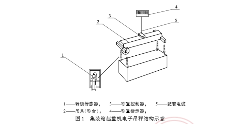 集装箱起重机电子吊秤的工作原理为:集装箱起重机使用吊具吊装集装箱,吊具四角装有转锁传感器,吊具吊起集装箱时,称重控制器计算四个转锁传感器检测到的集装箱总质量和偏载质量,并由指示装置显示