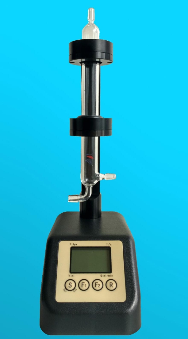 皂膜流量计是一根带有刻度的皂膜管,皂膜管下面有一个进气口,皂膜管的最下端接一胶球,胶球内装有皂膜液。电子皂膜流量计则是在皂膜管的外壁上安装有下限传感器和上限传感器并配有显示仪表。