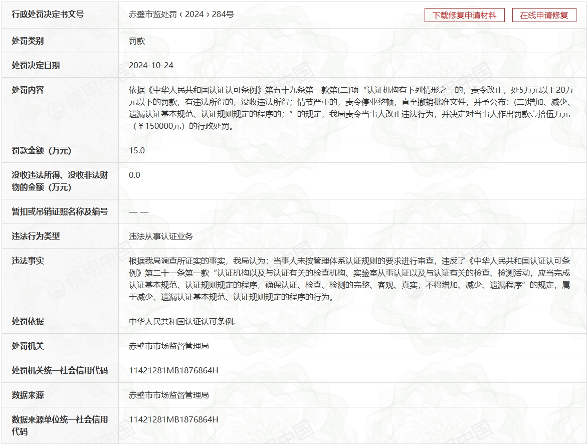 处罚事由: 违法从事认证业务