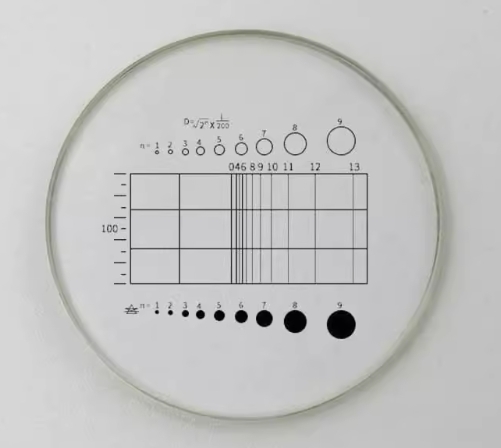目镜测微尺是中央有线纹、十字、栅格,圆等图案的圆形玻片,安装在显微镜目镜物体成像面,用于测量或标定显微图像的尺寸。
