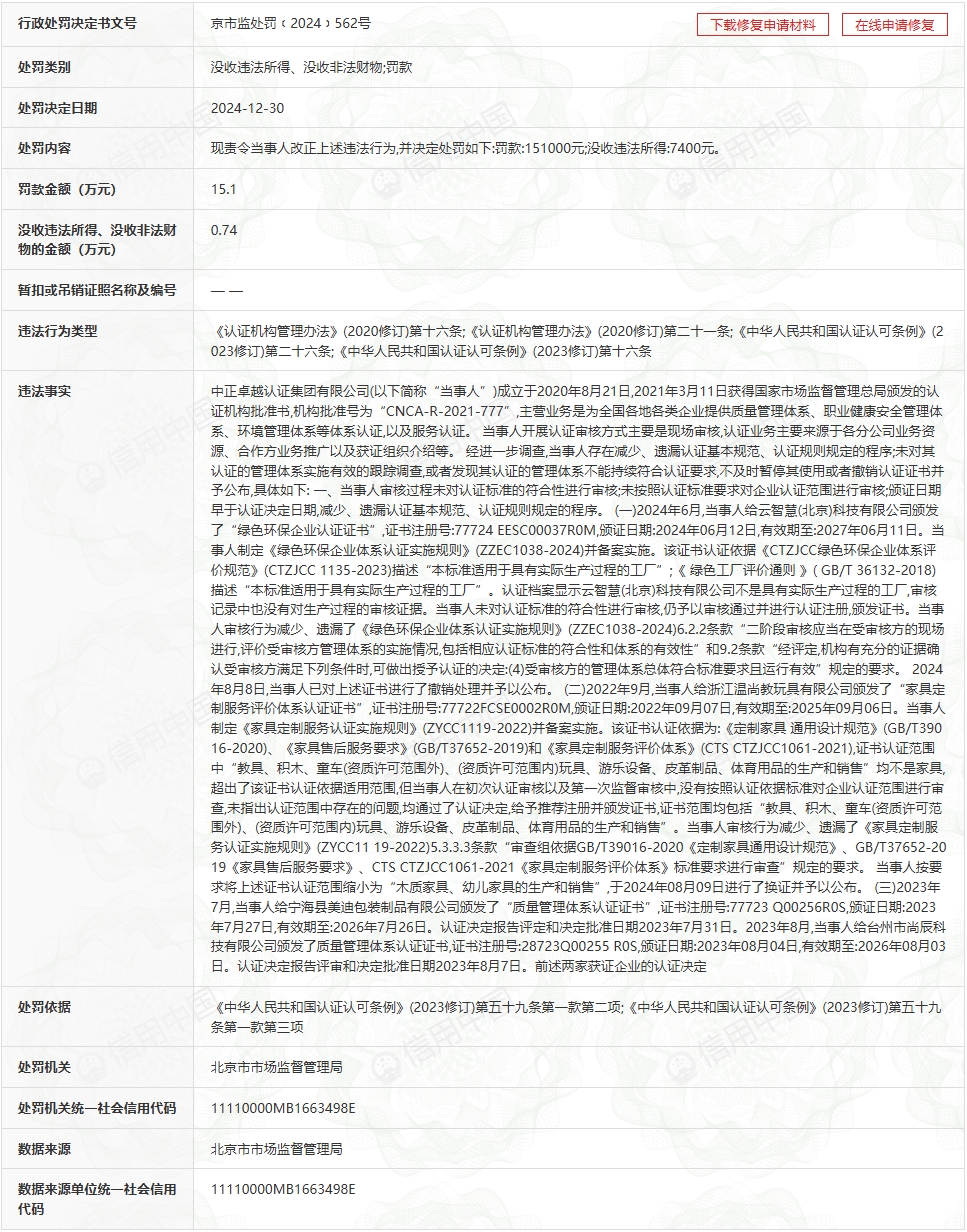 中正卓越认证集团有限公司(以下简称“当事人”)成立于2020年8月21日,2021年3月11日获得国家市场监督管理总局颁发的认证机构批准书,机构批准号为“CNCA-R-2021-777”,主营业务是为全国各地各类企业提供质量管理体系、职业健康安全管理体系、环境管理体系等体系认证,以及服务认证。 当事人开展认证审核方式主要是现场审核,认证业务主要来源于各分公司业务资源、合作方业务推广以及获证组织介绍等。 经进一步调查,当事人存在减少、遗漏认证基本规范、认证规则规定的程序;未对其认证的管理体系实施有效的跟踪调查,或者发现其认证的管理体系不能持续符合认证要求,不及时暂停其使用或者撤销认证证书并予公布,具体如下: 一、当事人审核过程未对认证标准的符合性进行审核;未按照认证标准要求对企业认证范围进行审核;颁证日期早于认证决定日期,减少、遗漏认证基本规范、认证规则规定的程序。 (一)2024年6月,当事人给云智慧(北京)科技有限公司颁发了“绿色环保企业认证证书”,证书注册号:77724 EESC00037R0M,颁证日期:2024年06月12日,有效期至:2027年06月11日。当事人制定《绿色环保企业体系认证实施规则》(ZZEC1038-2024)并备案实施。该证书认证依据《CTZJCC绿色环保企业体系评价规范》(CTZJCC 1135-2023)描述“本标准适用于具有实际生产过程的工厂”;《 绿色工厂评价通则 》( GB/T 36132-2018)描述“本标准适用于具有实际生产过程的工厂”。认证档案显示云智慧(北京)科技有限公司不是具有实际生产过程的工厂,审核记录中也没有对生产过程的审核证据。当事人未对认证标准的符合性进行审核,仍予以审核通过并进行认证注册,颁发证书。当事人审核行为减少、遗漏了《绿色环保企业体系认证实施规则》(ZZEC1038-2024)6.2.2条款“二阶段审核应当在受审核方的现场进行,评价受审核方管理体系的实施情况,包括相应认证标准的符合性和体系的有效性”和9.2条款“经评定,机构有充分的证据确认受审核方满足下列条件时,可做出授予认证的决定:(4)受审核方的管理体系总体符合标准要求且运行有效”规定的要求。 2024年8月8日,当事人已对上述证书进行了撤销处理并予以公布。 (二)2022年9月,当事人给浙江温尚教玩具有限公司颁发了“家具定制服务评价体系认证证书”,证书注册号:77722FCSE0002R0M,颁证日期:2022年09月07日,有效期至:2025年09月06日。当事人制定《家具定制服务认证实施规则》(ZYCC1119-2022)并备案实施。该证书认证依据为:《定制家具 通用设计规范》(GB/T39016-2020)、《家具售后服务要求》(GB/T37652-2019)和《家具定制服务评价体系》(CTS CTZJCC1061-2021),证书认证范围中“教具、积木、童车(资质许可范围外)、(资质许可范围内)玩具、游乐设备、皮革制品、体育用品的生产和销售”均不是家具,超出了该证书认证依据适用范围,但当事人在初次认证审核以及第一次监督审核中,没有按照认证依据标准对企业认证范围进行审查,未指出认证范围中存在的问题,均通过了认证决定,给予推荐注册并颁发证书,证书范围均包括“教具、积木、童车(资质许可范围外)、(资质许可范围内)玩具、游乐设备、皮革制品、体育用品的生产和销售”。当事人审核行为减少、遗漏了《家具定制服务认证实施规则》(ZYCC11 19-2022)5.3.3.3条款“审查组依据GB/T39016-2020《定制家具通用设计规范》、GB/T37652-2019《家具售后服务要求》、CTS CTZJCC1061-2021《家具定制服务评价体系》标准要求进行审查”规定的要求。 当事人按要求将上述证书认证范围缩小为“木质家具、幼儿家具的生产和销售”,于2024年08月09日进行了换证并予以公布。 (三)2023年7月,当事人给宁海县美迪包装制品有限公司颁发了“质量管理体系认证证书”,证书注册号:77723 Q00256R0S,颁证日期:2023年7月27日,有效期至:2026年7月26日。认证决定报告评定和决定批准日期2023年7月31日。2023年8月,当事人给台州市尚辰科技有限公司颁发了质量管理体系认证证书,证书注册号:28723Q00255 R0S,颁证日期:2023年08月04日,有效期至:2026年08月03日。认证决定报告评审和决定批准日期2023年8月7日。前述两家获证企业的认证决定
