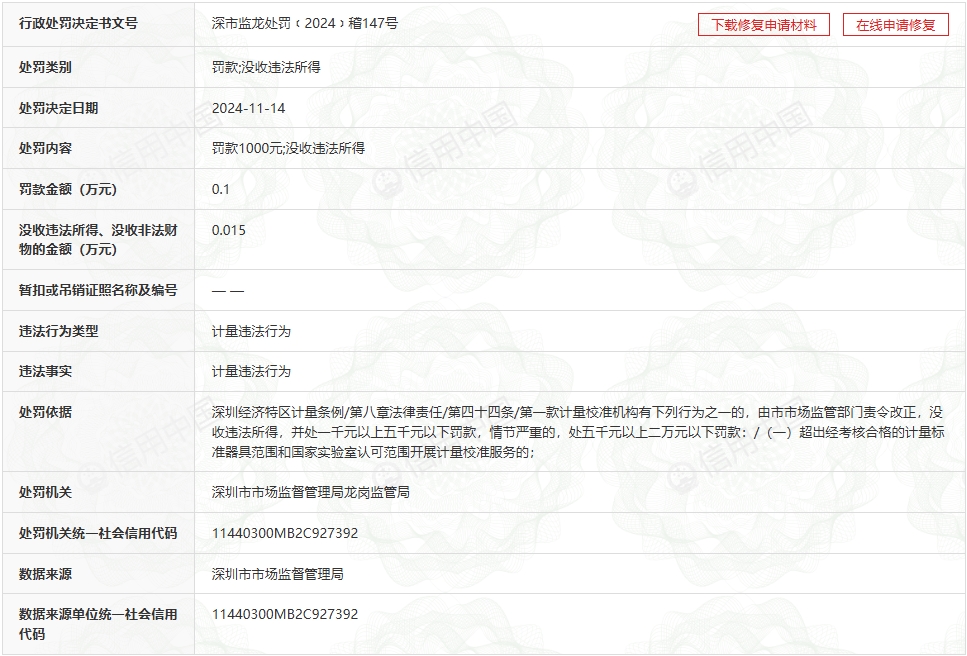 行政相对人名称: 深圳市南科计量检测集团有限公司