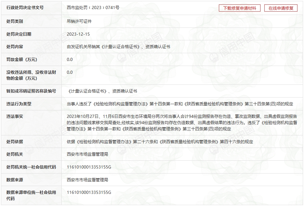 2023年10月27日、11月6日西安市生态环境局分两次将当事人合计94份监测报告存在伪造、篡改监测数据、出具虚假监测报告的违法问题线索移交我局查处,经核实,该94份监测报告均存在伪造数据、出具虚假结果的违法行为。违反了《检验检测机构监督管理办法》第十四条第一款和《陕西省质量检验机构管理条例》第三十四条第(四)项的规定