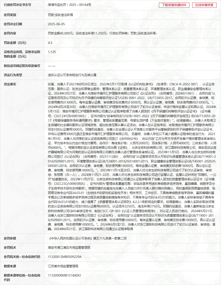 经查,当事人于2021年8月20日成立,2022年2月17日取得《认证机构批准书》(批准号:CNCA-R-2022-987),认证业务范围:服务认证:批发业和零售业服务;管理体系认证:质量管理体系认证、环境管理体系认证、职业健康安全管理体系认证。2024年3月27日,当事人与淮安市禧月汇护理服务有限公司签订《认证合同》(合同编号:2024031961),合同约定“认证服务项目及认可标识为月子保健机构等级评定认证T/GDBJ 0001-2022、GB/T33855-2017。合同初次认证费、审核费、标志使用费共计3000元,每年监督认证费、审核费及标志费共计3000元,再认证认证费、审核费、标志使用费共计3000元。”。2024年4月28至30日,当事人对淮安市禧月汇护理服务有限公司进行了初次认证审核,未进行每年监督认证和再认证。2024年5月15日,淮安市禧月汇护理服务有限公司通过认证程序取得了当事人颁发的《月子保健机构等级评定认证证书》(证书编号:CSCC24YZBJ0001R0S),证书内容为“经审核符合T/GDBJ 0001-2022《月子保健机构等级评定规范》和GB/T33855-2017《母婴保健服务场所通用要求》要求,管理体系覆盖范围:母婴生活护理(不含医疗服务)”。经调查确认,当事人未取得卫生保健和社会福利服务认证领域资格,超出批准范围从事认证活动。当事人在认证结束后,收取淮安市禧月汇护理服务有限公司支付的认证费用3000元。双随机检查后,当事人在全国认证认可信息公共服务平台撤销颁发的月子保健等级评定认证证书,并将认证费用3000元退还至淮安市禧月汇护理服务有限公司。 另查明,当事人存在以下减少遗漏认证程序的违法行为: 2023年1月5日,当事人与河南豹变认证咨询有限公司签订《合作协议书》,协议约定“乙方为甲方市场开发客户提供管理体系审核认证,甲方按本协议约定价格支付费用,合作价:单体系价格:人民币2000元;双体系价格:人民币4000元;三体系价格:人民币6000元。”。根据河南豹变认证咨询有限公司出具《证明》,北京生欧科技有限公司、浙江国跃科技有限公司、淮安圣犹达医疗器械有限公司为河南豹变认证咨询有限公司委托当事人进行管理体系审核认证。 2023年11月5日,当事人与北京生欧科技有限公司签订《认证合同》(合同编号:2023111280),合同约定“认证服务项目及认可标识为质量管理体系认证GB/T19001-2016/IS09001:2015、环境管理体系认证GB/T24001-2016/IS014001:2015、职业健康安全管理体系认证GB/T45001-2020/IS045001:2018。合同初次认证费、审核费、标志使用费18000元,每年监督认证费、审核费及标志费18000元,再认证认证费、审核费、标志使用费18000元。”。2023年11月16至20日,当事人对北京生欧科技有限公司进行了初次认证审核,审核组:张丽君(共一人)。2024年11月21-22日,当事人对北京生欧科技有限公司进行监督认证,监督认证时间在“双随机、一公开”检查整改后。2023年11月27日,北京生欧科技有限公司通过认证程序取得了当事人颁发的质量管理体系认证证书(证书编号:CSCC23Q100903R0S),证书内容为“管理体系覆盖范围:非临床医学用途的单细胞多组学测序、基因编辑、细胞学及分子生物学技术研究支持服务”。根据双随机检查组与当事人人员能力评价负责人顾付娟共同确认,同时查阅张丽君基础信息,张丽君没有专业代码34.03.01(生物技术的研究和实验性开发)相关学历、工作经历,不具有单细胞多组学测序、基因编辑的基本概念以及单细胞多组学测序过程及其质量控制措施有关知识,不具有专业代码34.03.01的能力。当事人安排审核组不具有专业代码34.03.01的能力,减少遗漏了《质量管理体系认证规则》4.2.2.1条款规定的要求。经调查确认,当事人实际收取由河南豹变认证咨询有限公司支付的认证费用6000元,认证成本2250元,违法所得3750元。双随机检查后,当事人重新制定北京生欧科技有限公司QMS审核任务书,制定CSCC-QP-003《认证人员管理控制程序》,对认证人员进行培训。 2024年5月21日,当事人与浙江国跃科技有限公司签订《认证合同》,合同约定“认证服务项目及认可标识为质量管理体系认证GB/T19001-2016/IS09001:2015。合同初次认证费、审核费、标志使用费10000元,每年监督认证费、审核费及标志费10000元,再认证认证费、审核费、标志使用费10000元。”。2024年6月5至7日,当事人对浙江国跃科技有限公司进行了初次认证审核,审核组:袁巍。2024年6月21日,浙江国跃科技有限公司通过认证程序取得
