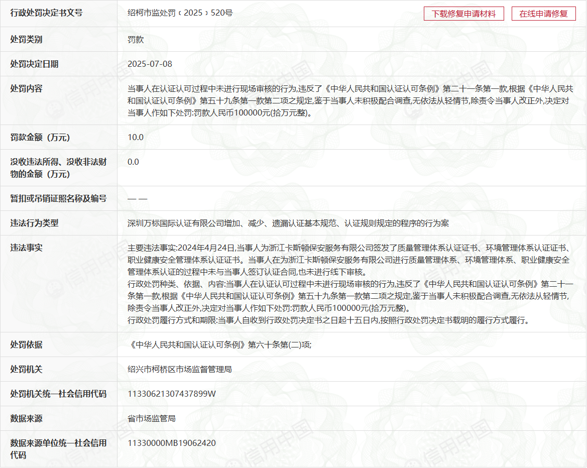 行政相对人名称: 深圳万标国际认证有限公司
