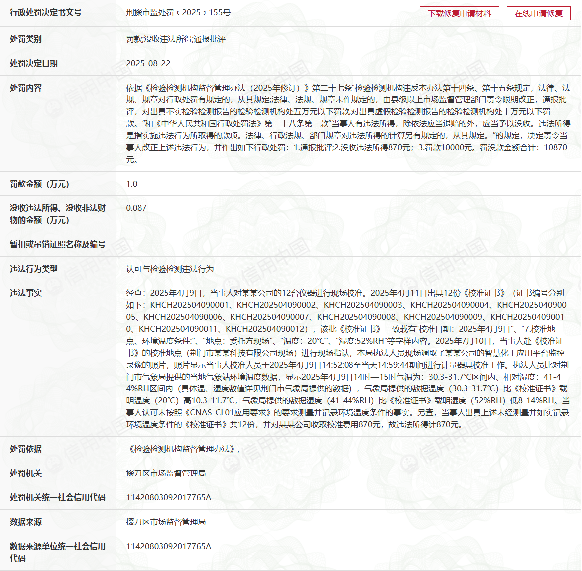 处罚依据: 依据《检验检测机构监督管理办法(2025年修订)》第二十七条“检验检测机构违反本办法第十四条、第十五条规定,法律、法规、规章对行政处罚有规定的,从其规定;法律、法规、规章未作规定的,由县级以上市场监督管理部门责令限期改正,通报批评,对出具不实检验检测报告的检验检测机构处五万元以下罚款,对出具虚假检验检测报告的检验检测机构处十万元以下罚款。”和《中华人民共和国行政处罚法》第二十八条第二款“当事人有违法所得,除依法应当退赔的外,应当予以没收。违法所得是指实施违法行为所取得的款项。法律、行政法规、部门规章对违法所得的计算另有规定的,从其规定。”的规定,决定责令当事人改正上述违法行为,并作出如下行政处罚:1.通报批评;2.没收违法所得870元;3.罚款10000元。罚没款金额合计:10870元。