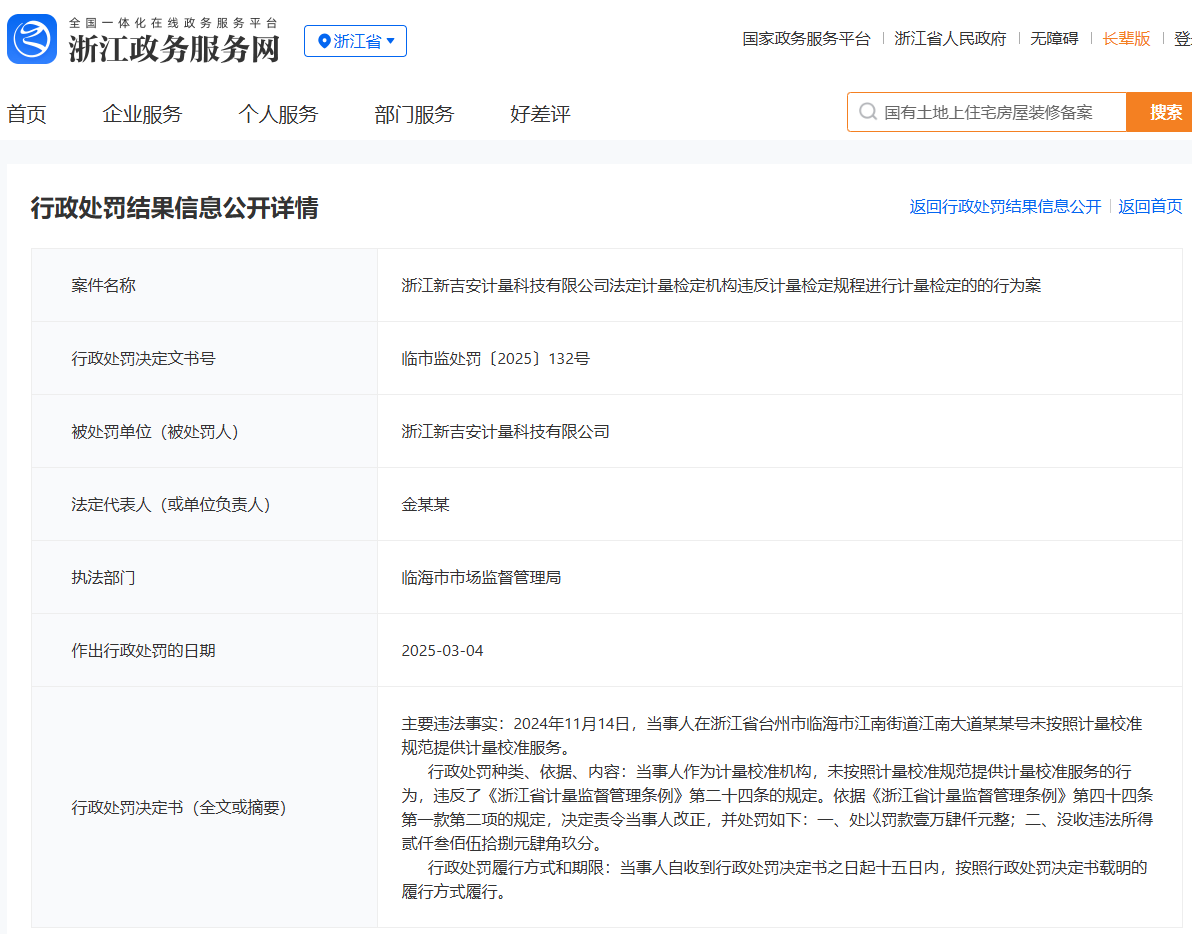 浙江新吉安计量科技有限公司法定计量检定机构违反计量检定规程进行计量检定的的行为案 |