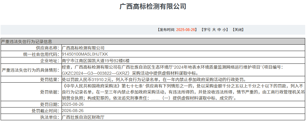 经查,广西高标检测有限公司在广西壮族自治区生态环境厅“2024年地表水环境质量监测网络运行维护项目”(项目编号:GXZC2024—G3—003822—GXRZ)采购活动中提供虚假材料谋取中标。 |