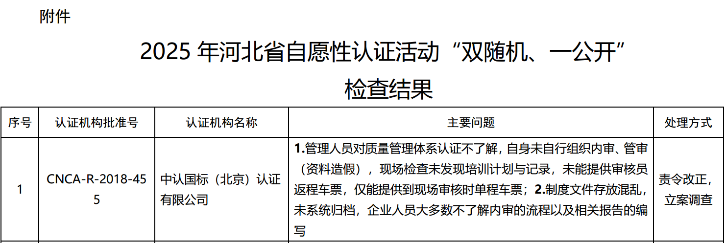1.河北省市场监督管理局关于2025年自愿性认证活动“双随机、一公开”检查结果的通告