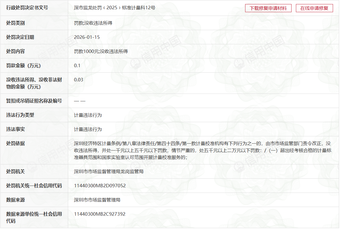 行政处罚决定书文号: 深市监龙处罚﹝2025﹞标准计量科12号