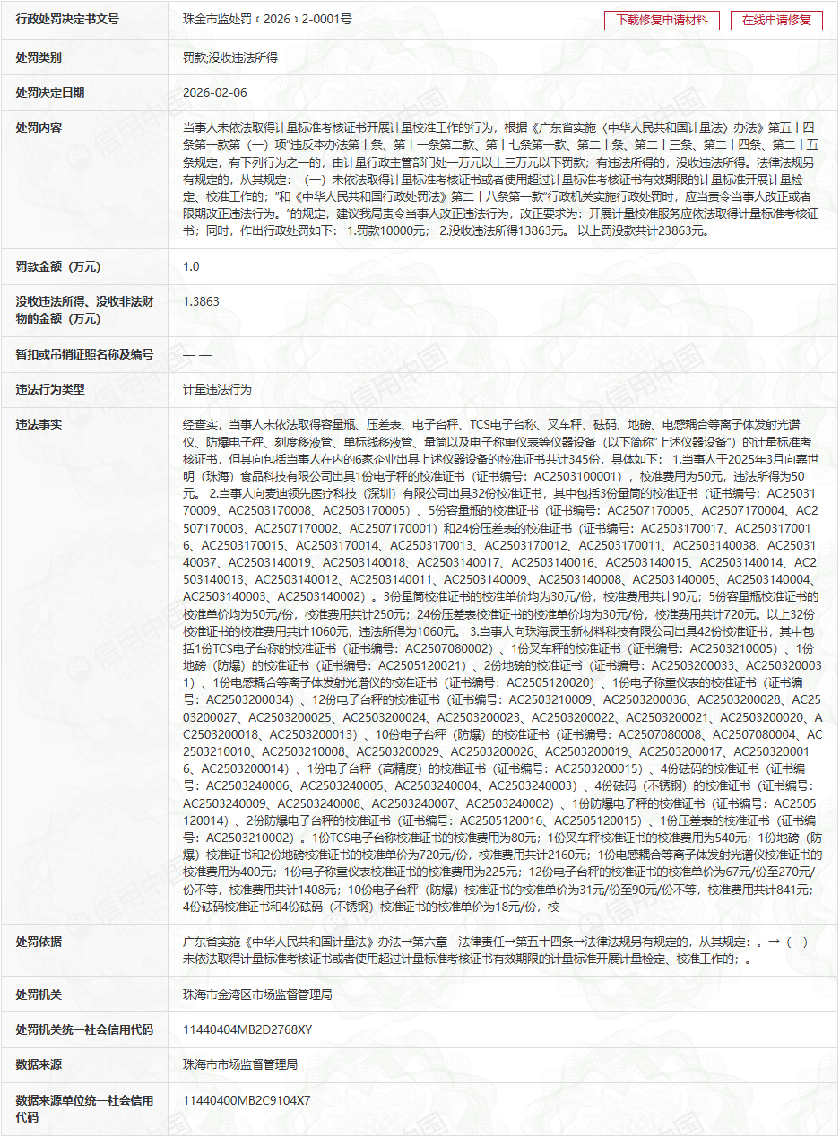 经查实,当事人未依法取得容量瓶、压差表、电子台秤、TCS电子台称、叉车秤、砝码、地磅、电感耦合等离子体发射光谱仪、防爆电子秤、刻度移液管、单标线移液管、量筒以及电子称重仪表等仪器设备(以下简称“上述仪器设备”)的计量标准考核证书,但其向包括当事人在内的6家企业出具上述仪器设备的校准证书共计345份,具体如下: