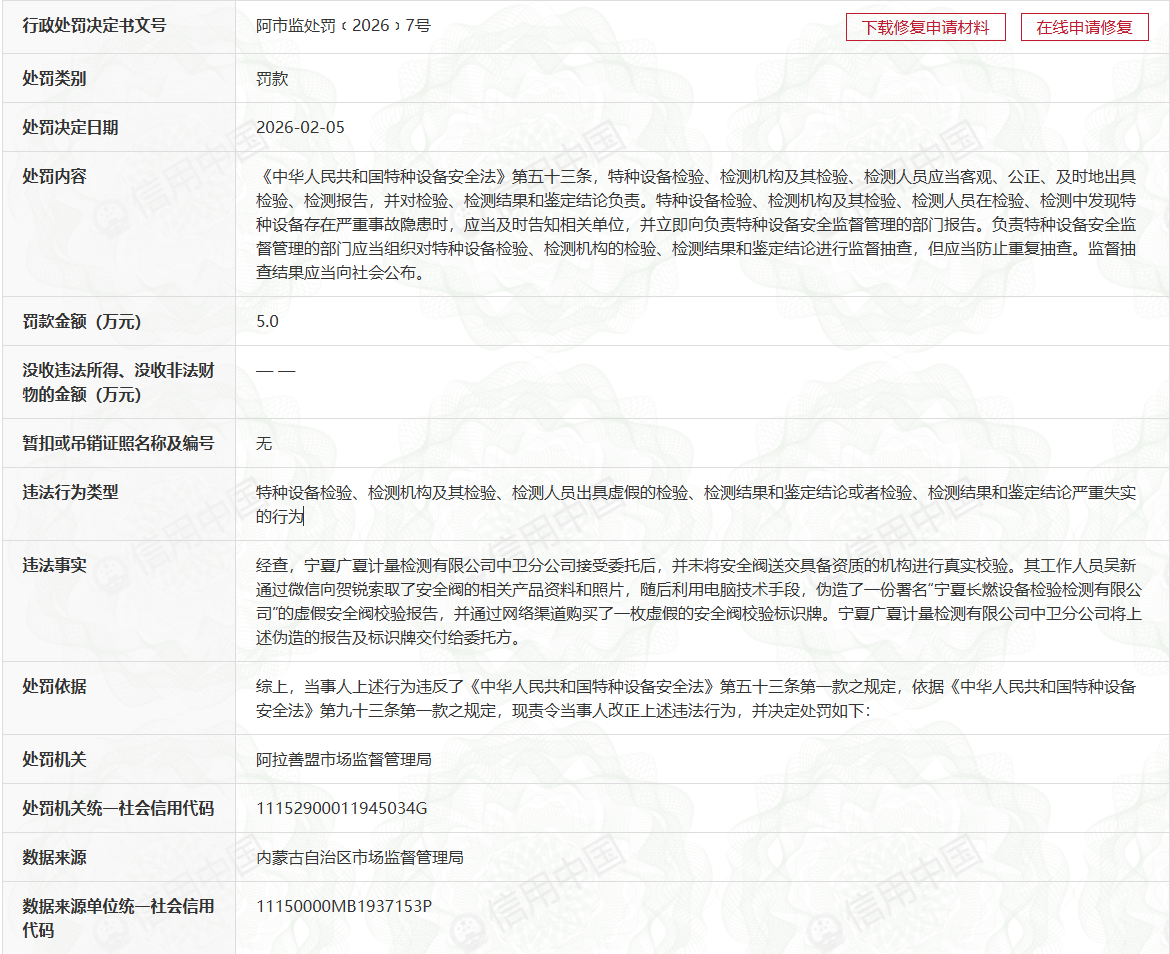 [出具虚假] 宁夏广夏计量检测有限公司中卫分公司