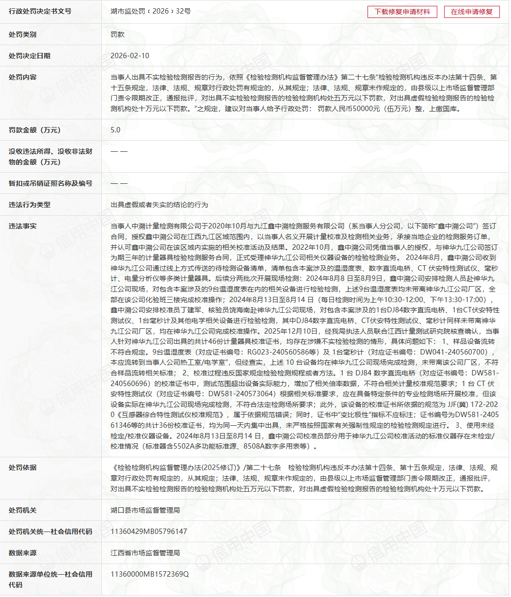 当事人中溯计量检测有限公司于2020年10月与九江鑫中溯检测服务有限公司(系当事人分公司,以下简称“鑫中溯公司”)签订合同,授权鑫中溯公司在江西九江区域范围内,以当事人名义开展计量校准及检测相关业务,承接当地企业的检测服务订单,并认可鑫中溯公司在该区域内实施的相关校准活动及结果。2022年10月,鑫中溯公司凭借当事人的授权,与神华九江公司签订为期三年的计量器具检验检测服务合同,正式受理神华九江公司相关仪器设备的检验检测业务。 2024年8月,鑫中溯公司收到神华九江公司通过线上方式传送的待检测设备清单,清单包含本案涉及的温湿度表、数字直流电桥、CT 伏安特性测试仪、毫秒计、电量分析仪等多类计量器具。后续分两批次开展现场检测:2024年8月8 日至8月9日,鑫中溯公司安排检测人员赴神华九江公司现场,对包含本案涉及的9台温湿度表在内的相关设备进行检验检测,上述9台温湿度表均未带离神华九江公司厂区,全部在该公司化验班三楼完成校准操作;2024年8月13日至8月14 日(每日检测时间为上午10:30-12:00、下午13:30-17:00),鑫中溯公司安排校准员丁建军、核验员饶海南赴神华九江公司现场,对包含本案涉及的1台DJ84数字直流电桥、1台CT伏安特性测试仪、1台毫秒计及其他电学相关设备进行检验检测,其中DJ84数字直流电桥、CT伏安特性测试仪、毫秒计同样未带离神华九江公司厂区,均在神华九江公司完成校准操作。2025年12月10日,经我局执法人员联合江西计量测试研究院核查确认,当事人针对神华九江公司出具的共计46份计量器具校准证书,均存在涉嫌不实检验检测的情形,具体问题如下: 1、样品设备流转不符合规定。9台温湿度表(对应证书编号:RG023-240560586等)及 1台毫秒计(对应证书编号:DW041-240560700),本应流转到当事人公司热工室/电学室”,但经查实,上述 10 台设备均在神华九江公司现场完成检测,未带离该公司厂区,不符合样品流转相关标准; 2、校准过程违反国家规定检验检测规程或者方法。1 台 DJ84 数字直流电桥(对应证书编号:DW581-240560696)的校准证书中,测试范围超出设备实际能力,增加了相关倍率数据,不符合相关计量校准规范要求;1 台 CT 伏安特性测试仪(对应证书编号:DW581-240573064)根据相关标准要求,应在具备特定条件的专业检测场所开展校准,但该设备实际在神华九江公司现场完成检测,不符合法定检测场所要求;此外,该设备的校准证书所依据的规范为 JJF(冀) 172-2020《互感器综合特性测试仪校准规范》,属于依据规范错误;同时,证书中“变比极性”指标不应标注;证书编号为DW581-240561346等的共计36份校准证书,均为同一天内集中出具,未严格按照国家有关强制性规定的检验检测规定进行。 3、使用未经检定/校准仪器设备。2024年8月13日至8月14 日,鑫中溯公司校准员部分用于神华九江公司校准活动的标准仪器存在未检定/校准情况(标准器含5502A多功能标准源、8508A数字多用表等)。 |