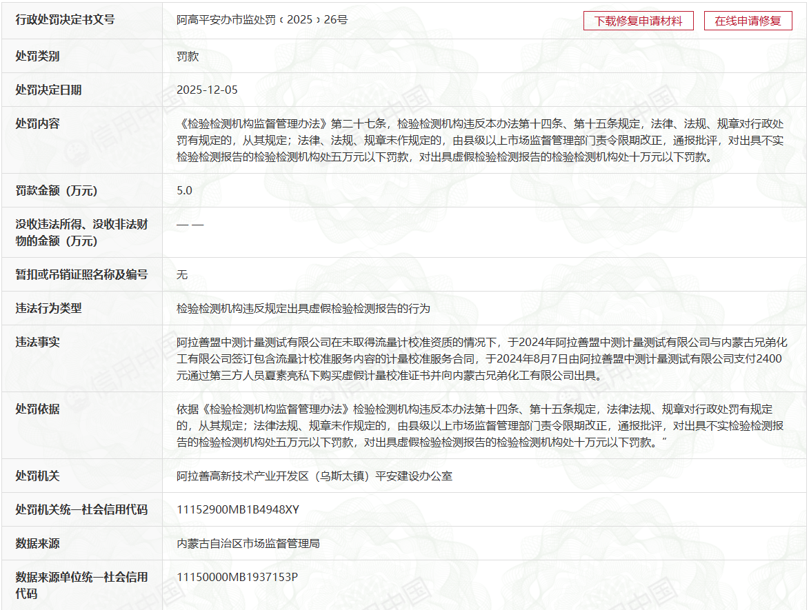 行政相对人名称: 阿拉善盟中测计量测试有限公司