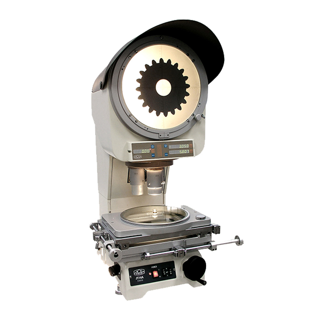 投影仪是光、机、电一体化的计量仪器,利用光学放大原理,将被测物体经过光学系统放大后成像在影屏上进行观察测量,光学原理见图1。从光源1发出的光束,通过聚光镜组2后变成平行光照亮被测物体3,在经过物镜组4将其影像5投影到影屏6上,对工件进行轮廓测量或坐标测量。其主要结构型式分为立式投影仪(物镜光轴垂直于工作台面,结构型式见图 2)和卧式投影仪(物镜光轴平行于工作台面,结构型式见图 3)两种。 |