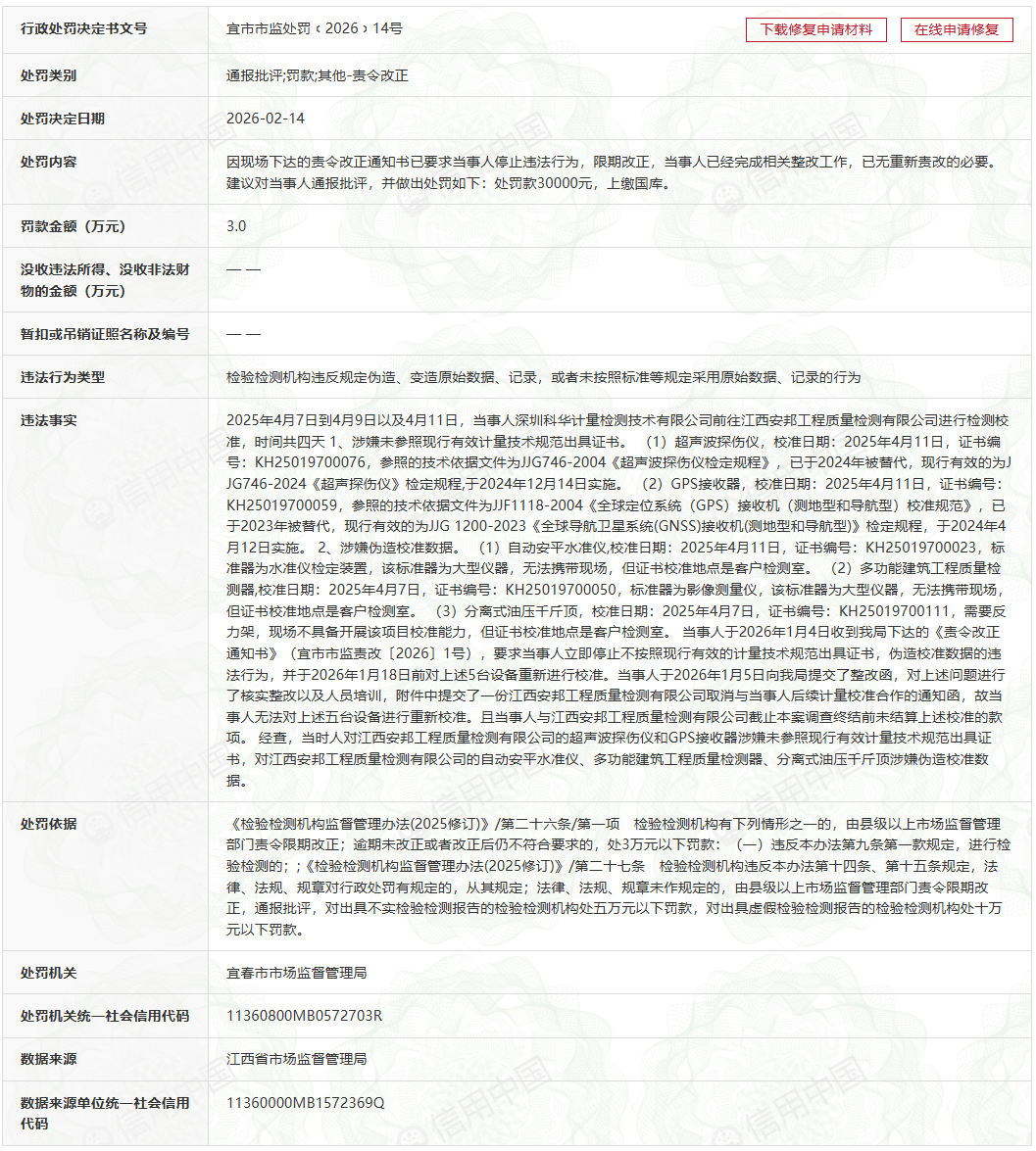 当事人于2026年1月4日收到我局下达的《责令改正通知书》(宜市市监责改〔2026〕1号),要求当事人立即停止不按照现行有效的计量技术规范出具证书,伪造校准数据的违法行为,并于2026年1月18日前对上述5台设备重新进行校准。当事人于2026年1月5日向我局提交了整改报告,对上述问题进行了核实整改以及人员培训,附件中提交了一份江西安邦工程质量检测有限公司取消与当事人后续计量校准合作的通知函,故当事人无法对上述五台设备进行重新校准。且当事人与江西安邦工程质量检测有限公司截止本案调查终结前未结算上述校准的款项。经查,当时人对江西安邦工程质量检测有限公司的超声波探伤仪和GPS接收器涉嫌未参照现行有效计量技术规范出具证书,对江西安邦工程质量检测有限公司的自动安平水准仪、多功能建筑工程质量检测器、分离式油压千斤顶涉嫌伪造校准数据。
