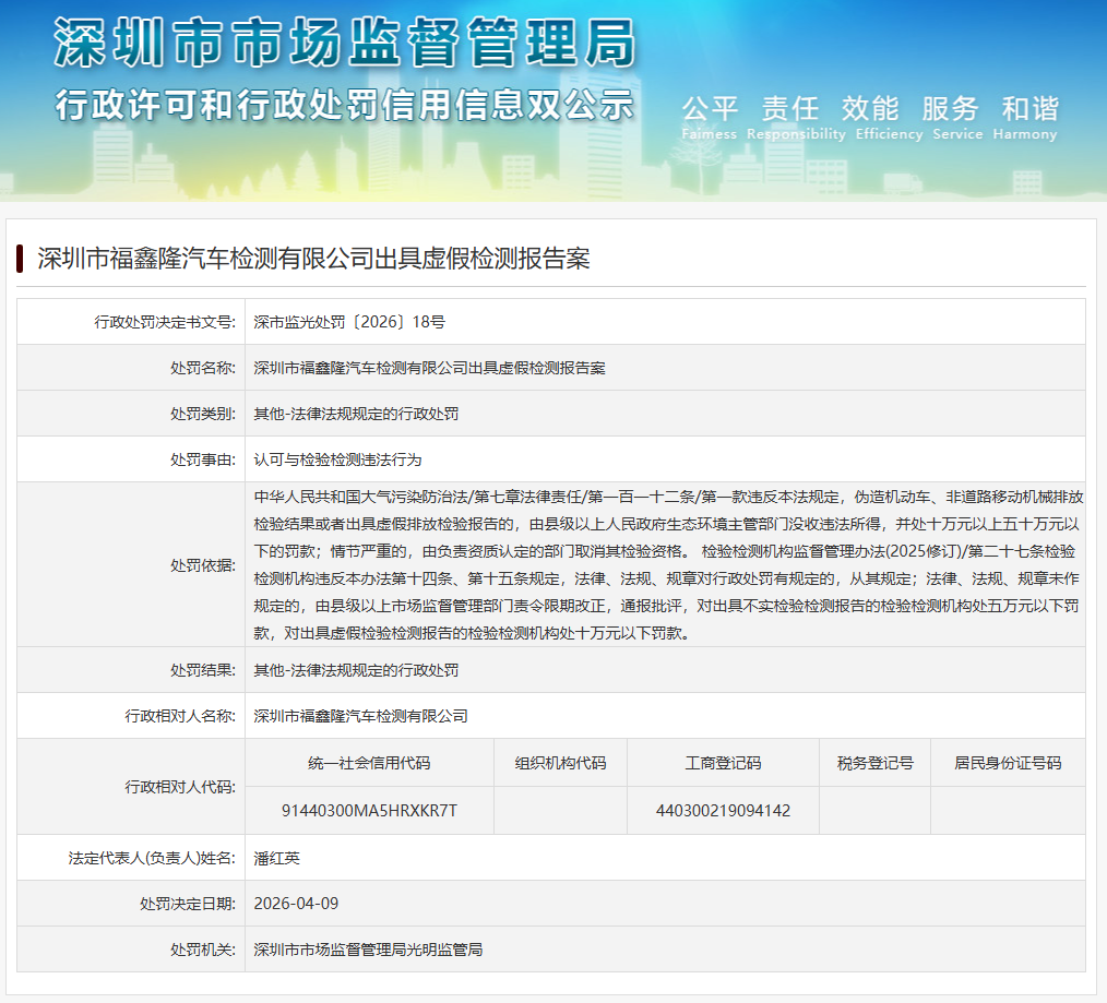 行政相对人名称: 深圳市福鑫隆汽车检测有限公司