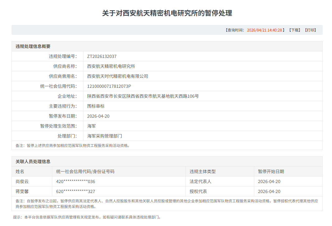 [问题机构] 西安航天精密机电研究所